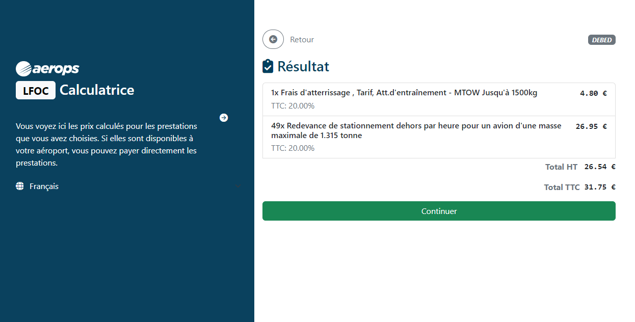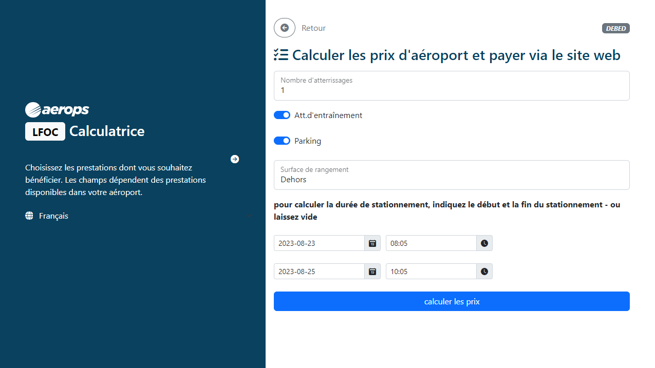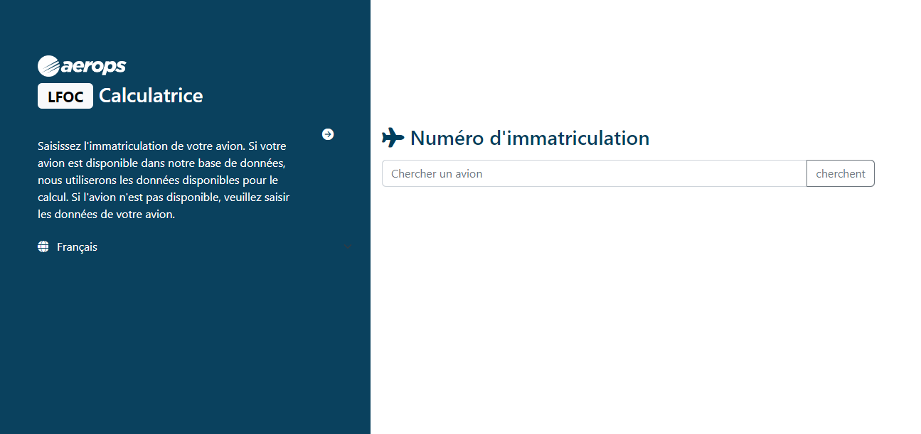 Les pilotes accèdent le calculateur à travers votre propre site web ou l'application aerops. Les pilotes y peuvent entrer l'immatriculation de leur avion.